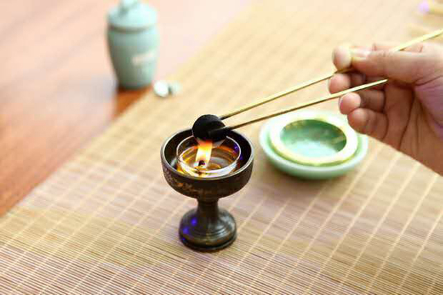 用明火或在炭炉上点燃香炭,待其烧透,没有明火并变至红色,烟气消失,即可用来熏香了。