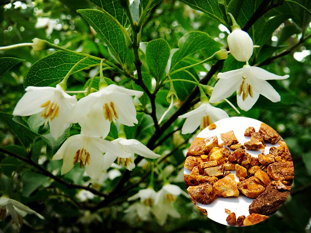 安息香取自安息香科安息香属(Styrax)树种的香树脂。其成品略似乳香,多为扁球形颗粒,或压结成团块,大小不等,表面粗糙不平,呈橙黄色至深棕色,断面呈乳白色。质地坚脆,预热则变软。