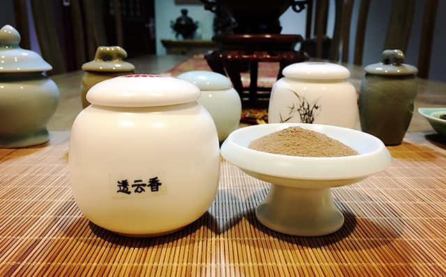 透云香粉的独特配方:白檀、 乳香、蒿本、零陵香、芸香、蜘蛛香、龙脑、甘松、丁香枝等,使得它出来的韵味令品赏者头脑清醒,气定神宁。